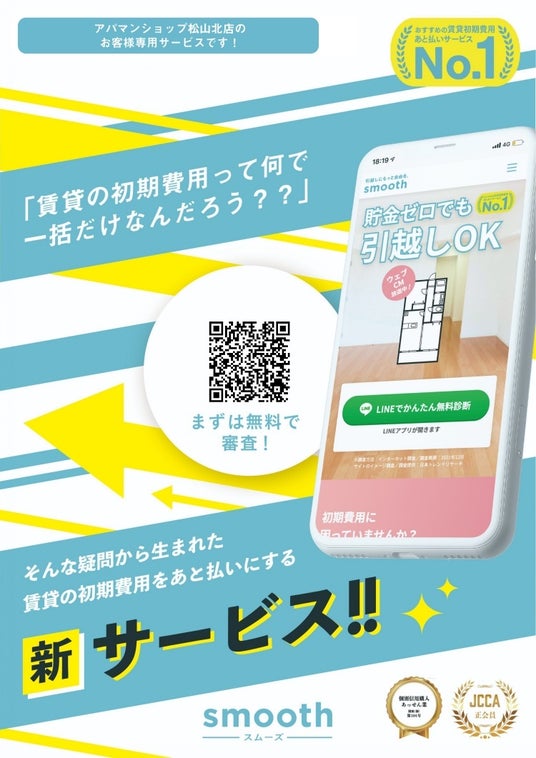 株式会社三福綜合不動産(愛媛県松山市)は、運営するアパマンショップ松山北店・松山南店・松山国道11号店の各店舗において、賃貸マンション・アパート契約時の初期費用(敷金・礼金・仲介手数料・保証料など)を分割・あと払いできるサービス「スムーズ」の取り扱いを開始いたしました。