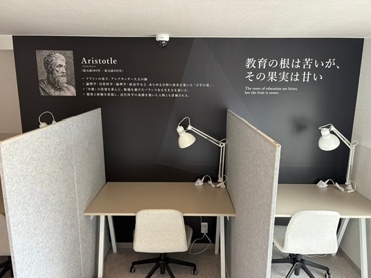 2階は『アリストテレス』の思想をテーマにした空間で、これまでの自習室同様に、個別ブースを8席とドリンクカウンターをご準備しております。