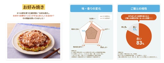 官能評価の結果、お好み焼きにかつお節を加えることで「うま味」「コク」「芳ばしさ」が強まり、味にまとまりが出ることが確認されました。また、肉のくさみが弱まる傾向も見られ、ご飯との相性が良くなったと回答した学生が83%にのぼりました。学生からは、「かつお節のうま味がソースの風味を向上させていた」、「かつお節をかけた方がご飯との相性が良かった」といった声が寄せられました。加えて、調理学の視点から本田講師のコメントも掲載し、科学的な観点からお好み焼きとかつお節の相性を検証しています。