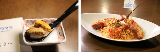 佐田岬灯台周辺で実施したのは「佐田岬灯台 トウダイモトウマシ探求ツアー クルージング編」です。地元の観光交流拠点施設である「佐田岬はなはな」を出航したクルーズ船は、日本一長細い半島としても知られる佐田岬半島の沿岸を進みます。ガイド役を務めたのは佐田岬半島ミュージアム主任学芸員である高嶋賢二さん。灯台周辺の地質やこの地域に根付く伝統的な漁法である漁士(あまし)について、高嶋さんの解説を聞きながら灯台へ進みます。到着後は、松山海上保安部の協力により実現した佐田岬灯台の塔頂体験。灯台の真下で行われているイセエビ漁の仕掛けを見学し、灯台周辺の複雑な地形や速い海流が、イセエビやアカウニ、アワビなどこの地域の誇る絶品の水産資源を育んでいることを間近で感じました。ツアーの最後は、お楽しみの食事会。佐田岬灯台周辺で獲れたイセエビ、アカウニ、サザエを使った超豪華な特別メニューを実食!この日準備したのは、「赤ウニ1スプーン」、「伊勢海老のパスタ」、「サザエの香草パン粉焼き」など、この日限りの特別メニュー。参加者は、先ほど見学した佐田岬灯台とその周辺の漁場の様子を思い出しながら、灯台×水産資源から生まれた「トウダイモトウマシ」な瞬間を堪能しました。