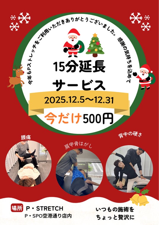 【愛媛・松山】株式会社三福ホールディングス(本社:愛媛県松山市)が運営する松山市のスポーツジムP・SPO空港通り店内にあるストレッチ整体専門店P・STRETCH(ピーストレッチ)空港通り店では、日頃のご愛顧への感謝を込めて、12月限定の「クリスマス特別企画」を開始いたします。
