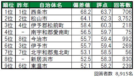 西条市が、4年連続で1位に輝きました。2位は3年連続で松山市で、「愛着がある」「住みここち」など複数の項目で1位の高い評価を得ている街です。3位は、昨年4位から一つ順位を上げた伊予郡松前町です。トップ9内では、4位南宇和郡愛南町、8位新居浜市がランクイン、いずれも昨年は偏差値50未満のため順位非公開だった自治体です。