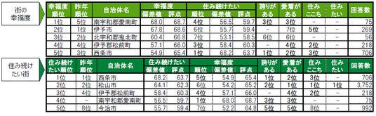 街の幸福度は、1位南宇和郡愛南町、2位伊予市、3位北宇和郡鬼北町。