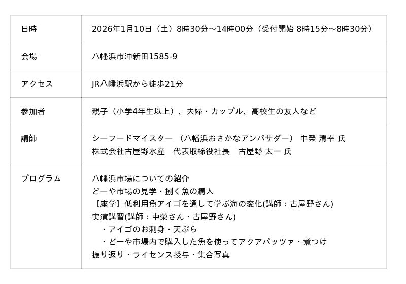 今回は、琥珀アイゴを小型定置網で漁獲する様子を事前に取材し、当日映像で紹介します。一般開放されているどーや市場では見学を行い、実習で使用する魚を自ら購入。調理ではアクアパッツァ・煮魚に挑戦し、海の恵みをより身近に感じられる内容となっております。