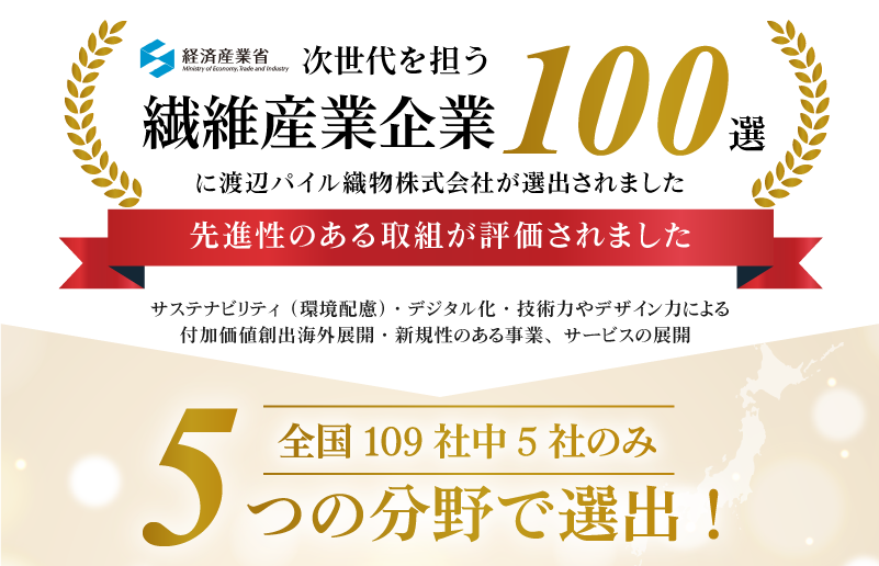 経済産業省が認定する「次世代を担う繊維産業企業100選」に選出されており、5つの分野全てで先進的な取組が評価されています。