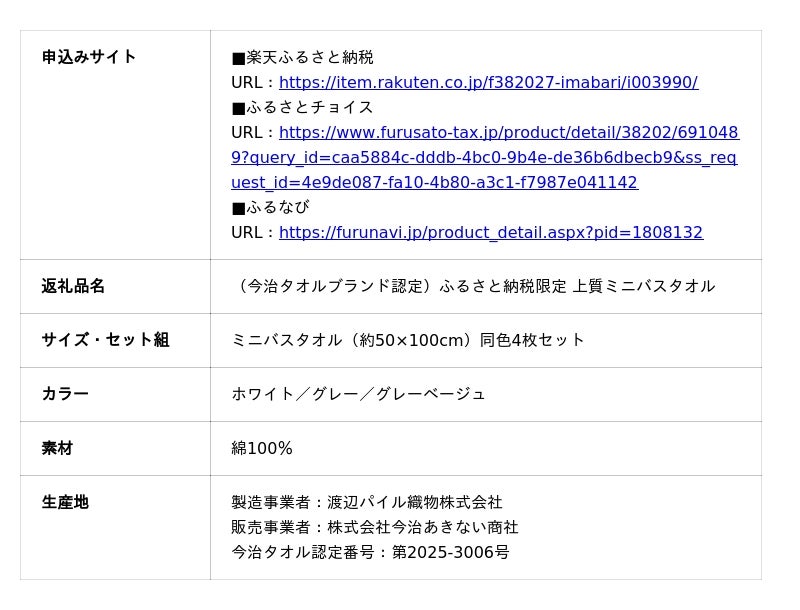この度、株式会社今治あきない商社(所在:愛媛県今治市、代表取締役:阿部秀二郎)は、タオルメーカー:渡辺パイル織物株式会社と『ふるさと納税限定タオル開発プロジェクト第3弾』として共同開発した『上質ミニバスタオル』について、今治市ふるさと納税で寄附受付を開始したことを発表します。