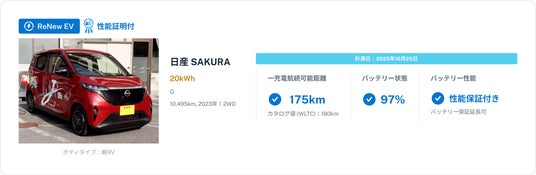 (*2)ReNew EV(リニューEV):「性能証明」、「残価保証」、「バッテリー性能保証」、「再整備」を備えることで、リユースEVに対する品質面の不安を軽減し、安心して選べる高品質なリユースEVです。一般的なリユースEVは、前オーナーの使用状態のまま販売されることが多く、車両状態にばらつきが生じやすいという課題があります。これに対し、「ReNew EV」は、新車に近い品質を保ちながら価格を抑えられる仕組みとすることで、安心感を重視する日本のユーザーにとって新たな選択肢として注目されています。