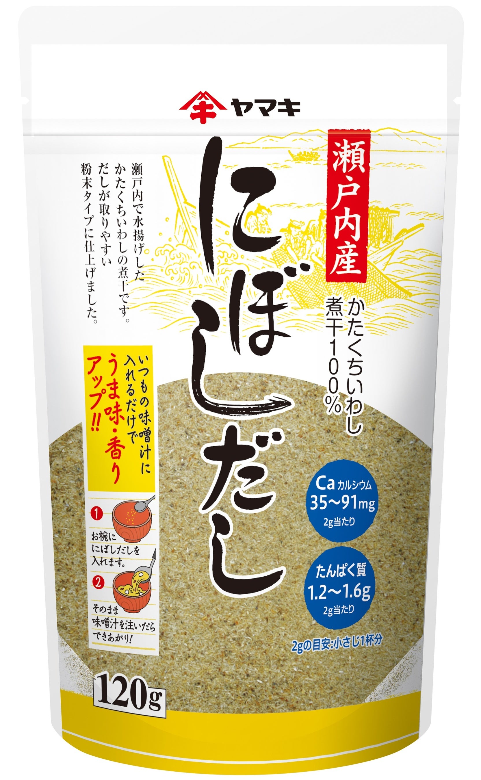 原料には煮干を使用しており、魚由来のたんぱく質とカルシウムが多く含まれています。また、パッケージ裏面では味噌汁をワンランクアップさせる使い方を紹介。小さじ1杯を加えるだけで、手軽においしさもプラスできます。