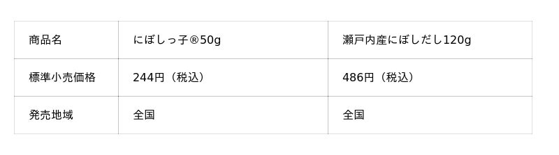 「にぼしっ子(R)50g」は2月中旬より、「瀬戸内産にぼしだし120g」は6月中旬より、順次店頭にて切り替え予定。