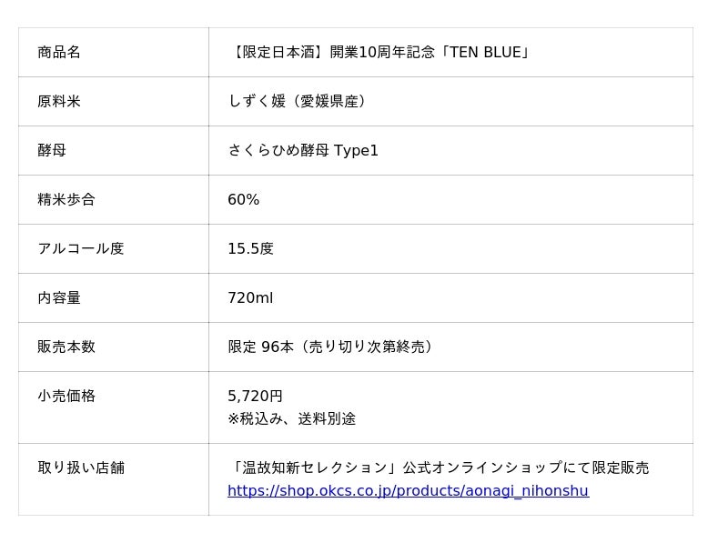1895年(明治28年)創業、松山・道後地区唯一の造り酒屋である水口酒造株式会社(本社:愛媛県松山市、代表取締役:水口皓介、以下 水口酒造)は、「瀬戸内リトリート 青凪 by 温故知新(以下、青凪)」の開業10周年を記念し、オリジナルコラボレーション日本酒「TEN BLUE」を2026年1月17日(土)より発売いたします。