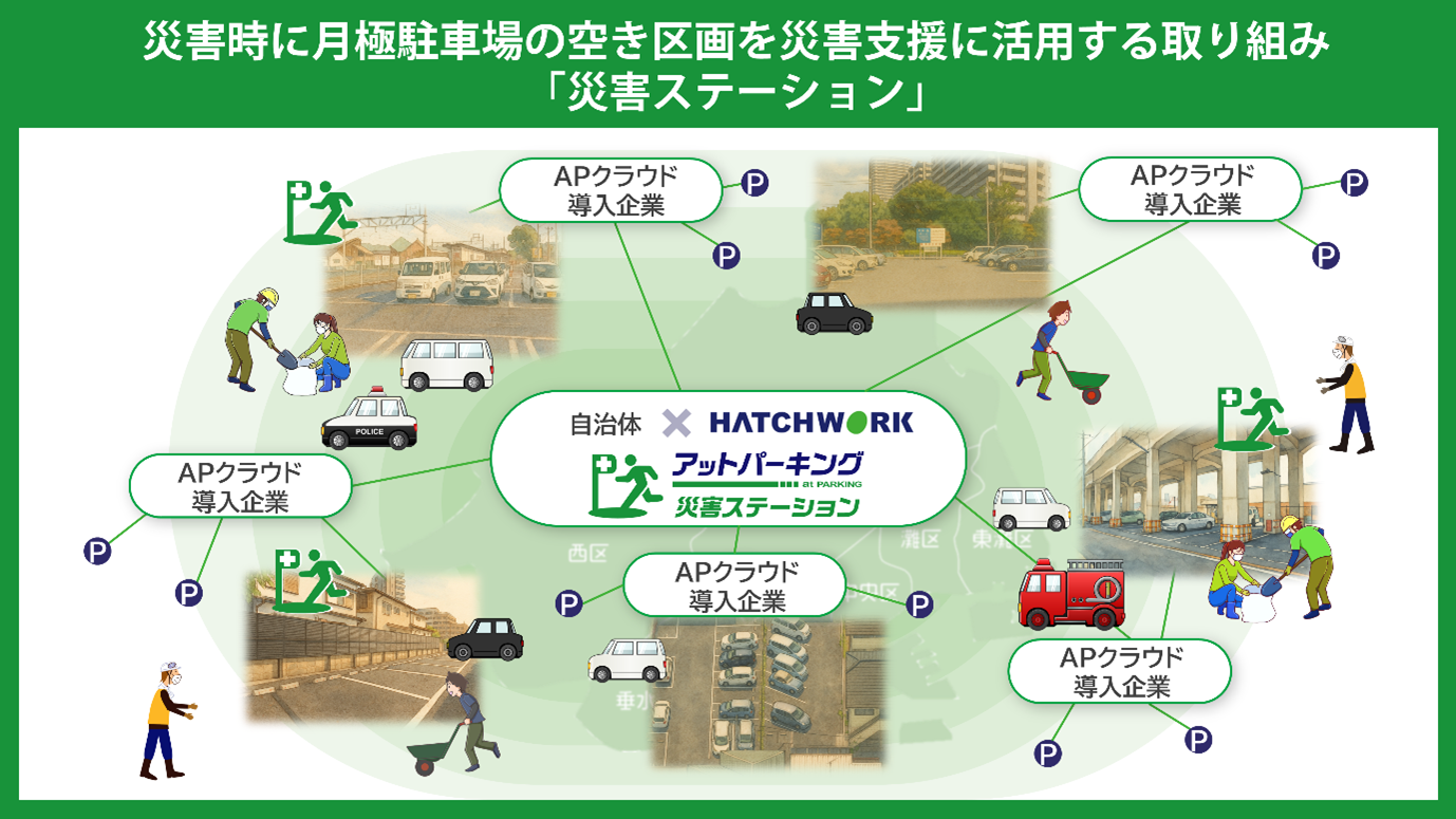 「災害ステーション」は、ハッチ・ワークが提供する月極駐車場オンライン管理支援サービス「アットパーキングクラウド」を活用し、同サービスを導入する不動産管理会社の協力を得ることで、災害時に月極駐車場の利用状況を迅速かつ効率的に把握し、必要な区画を確保するスキームを構築します。