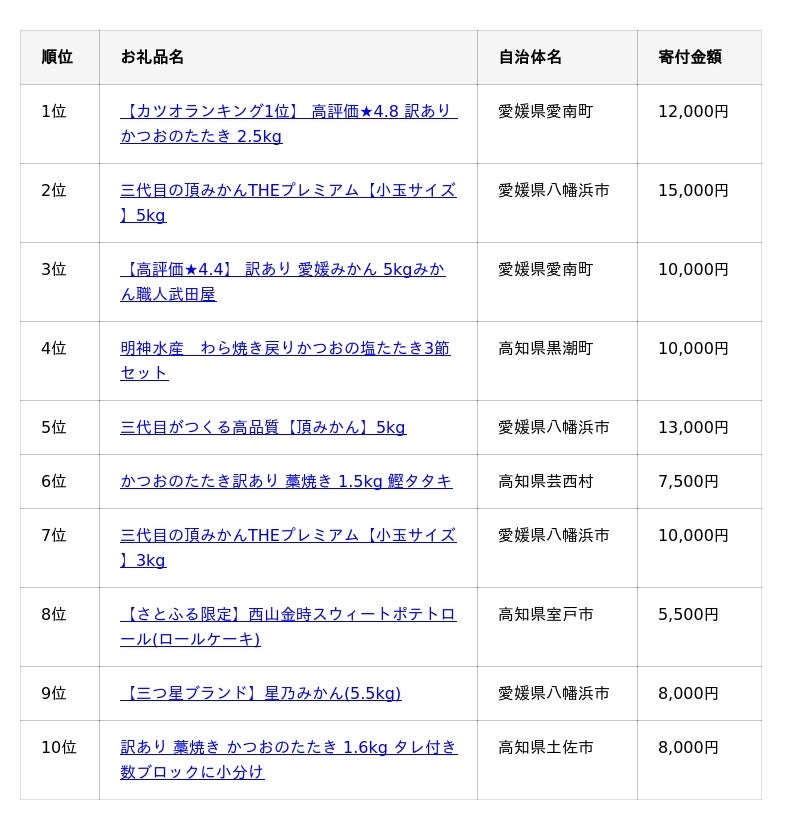 ■<四国版>2025年ふるさと納税人気お礼品ランキング(確定)