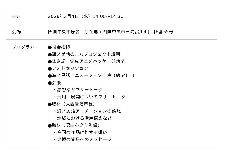 一般社団法人日本昔ばなし協会が取り組む「海ノ民話のまちプロジェクト」は、2026年2月4日(水)に愛媛県四国中央市を舞台にした海ノ民話アニメーション「鯛寄せ石」が完成したため、アニメ監督が四国中央市を訪問しアニメのお披露目と「海ノ民話のまち」認定式を実施しました。