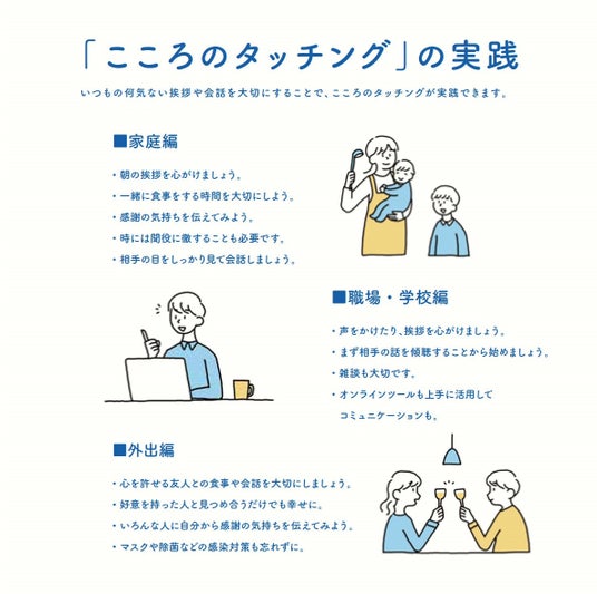 触れ合いには、手をつなぐ・さする・抱きしめ合うといった「からだ」の触れ合いと、目と目を合わせる・優しく接する・感謝を伝えるといった「こころ」の触れ合いがあります。本プロジェクトではこの2つの触れ合いの大切さを伝えるとともに、効果的に幸せホルモン「オキシトシン」を分泌させるためのタッチングノウハウを専門家の監修のもと開発し、特設サイトや「エッセンシャルタッチブック」を通して発信しています。