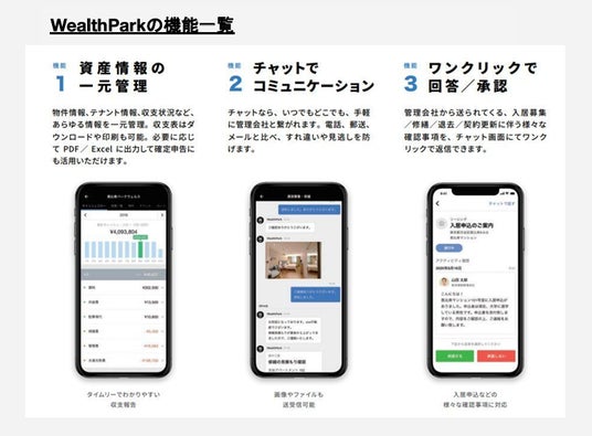 WealthParkは、スマートフォンアプリを通じて、いつでもどこでも手軽に保有物件の収支状況や契約内容、各種お知らせなどを確認できるサービスです。