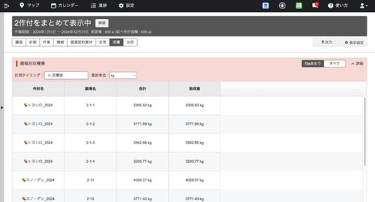 全圃場のデータをリスト化し、農機稼働時間や反収(単位面積あたりの収穫量)を集計・比較し
