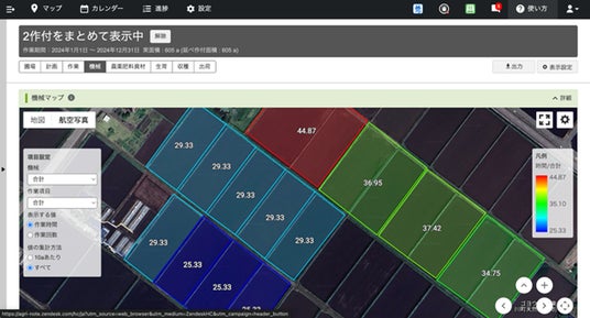 アグリノート上に登録された「農機稼働時間」および「収穫量」等のデータを航空写真マップ上