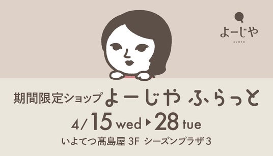 株式会社よーじや(京都府京都市下京区、代表取締役・國枝昂)が運営する、京都発のライフスタイルブランド「よーじや」は、2026年4月15日(水)~4月28日(火)の期間、愛媛県・いよてつ高島屋にて、期間限定ショップ「よーじやふらっと」を開催いたします。2025年10月にいよてつ高島屋で当イベントを初開催した際には、大変ご好評をいただきました。そしてこのたび、2回目の開催が決定。期間限定「あおゆらら」シリーズをはじめとしたスキンケアアイテムや雑貨に加え、「よじこ」グッズ第3弾を販売いたします。また、条件に応じたオリジナルグッズのプレゼントも。この機会に、期間限定ショップ「よーじやふらっと」にお立ち寄りください。