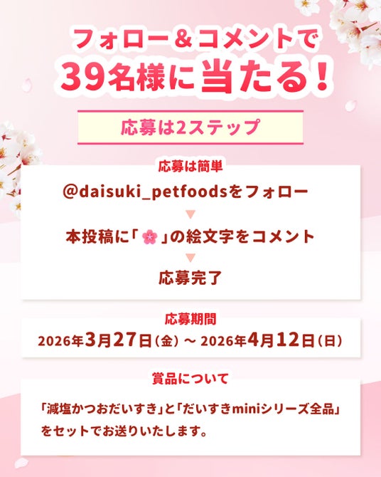 桜の開花宣言が全国各地で発表になるこの時期に、いつもだいすきシリーズを応援してくださるみなさんに感謝を込めて、春の感謝祭を企画しました。ねこちゃん・わんちゃんの健康を考えた大人気商品「減塩かつおだいすき」と、春のお出かけにも小さくて持ち運びやすい「だいすきミニシリーズ全種」をセットにして39(サンキュー!)名様にプレゼントします。ねこちゃん・わんちゃんとのお花見にもおすすめの「だいすきミニシリーズ」。この機会にぜひ、ご応募ください。