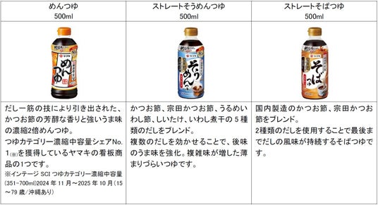 また、「鰹節の日(11月24日)」を記念して制作し、「かわいい!」とご好評をいただいた「めんつゆアクリルキーホルダー」を、本キャンペーンにあわせて改めてご用意しました。さらに、夏を先取りするヤマキ商品セットとして、定番の「めんつゆ」に加え、「ストレートそうめんつゆ」「ストレートそばつゆ」をラインナップしています。